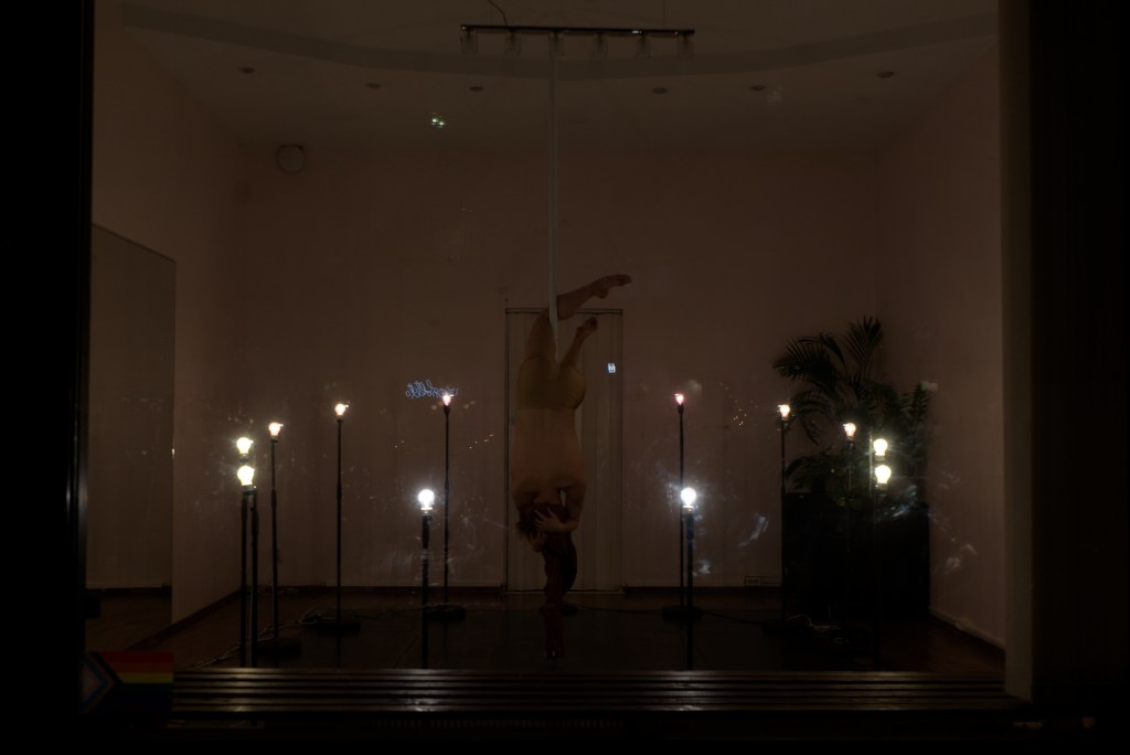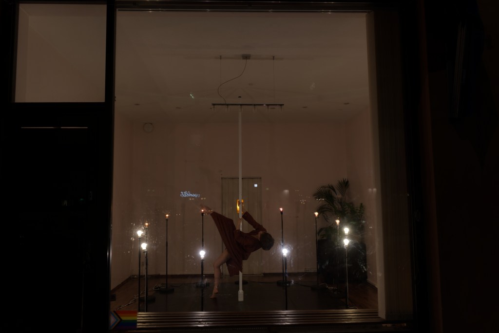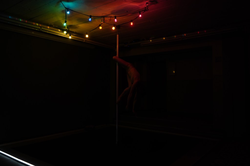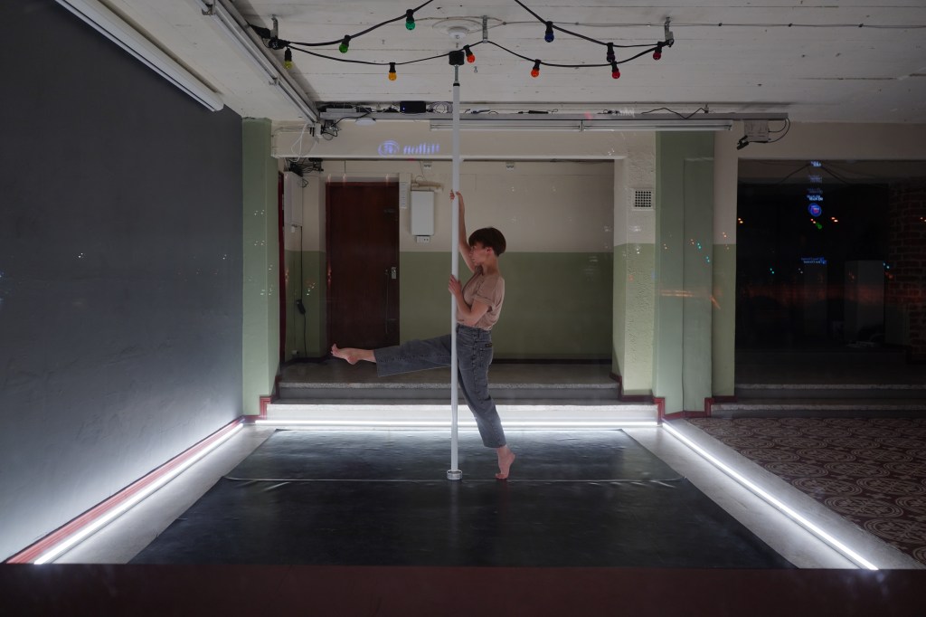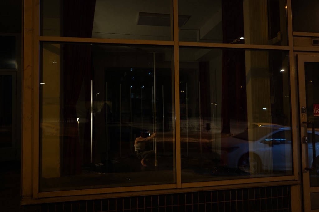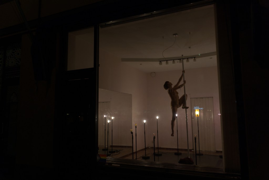 Hfobia is a pole dance performance presented in a display window, consisting of three separate solos. The work explores the good girl–bad girl dichotomy, forbidden positions, and the dismantling of embodied walls. Hfobia is the artist’s personal attempt to reprogram assumptions held both by performer and by society about movement, pole dance, and sexuality. The solos draw inspiration from roles historically imposed on women – Madonna, victim, and whore – but instead of repeating these established archetypes, the work seeks alternatives. What images of womanhood exist today or might exist in the future? Do we need such images?